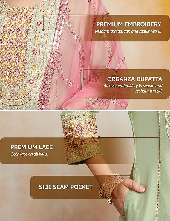 - PRODUCT DETAILS: 3-piece set featuring kalidar kurta with 3/4th sleeves, zari & sequin embroidery and side pocket, paired with straight fit pyjama and embroidered organza dupatta.